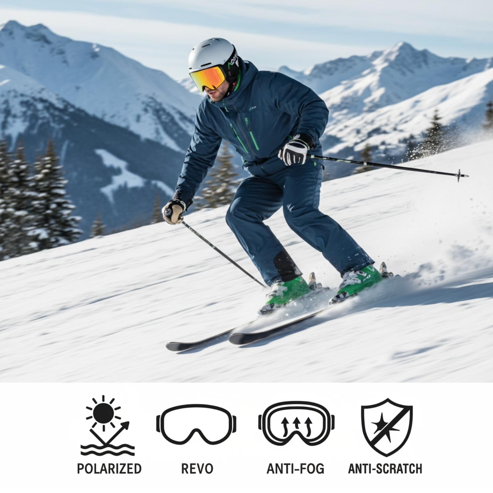 • Gepolariseerde en spiegelende lens tegen schittering op sneeuw